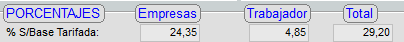 - Los tipos sobre Base Tarifada. Para el ejercicio 2026 el MEI será de un 0,90%, de los que el 0,75% será a cargo del empleador y el 0,15% a cargo del trabajador. Con lo que los % S/Base Tarifada quedarían en un 24,35 para la empresa y 4,85 para el trabajador. br>