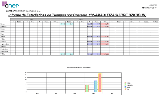 | Accede a la consulta de Estadísticas de Tiempos X Operario. Este formulario nos permite consultar los tiempos de trabajo, paradas y totales x meses de los cinco ultimos años. (Los datos los regenera el agente) |