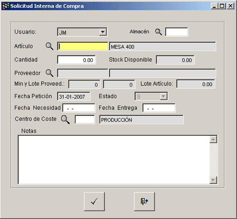 | Los campos USUARIO y ESTADO son automáticos. El Usuario se limita a pedir un artículo y el por qué. | ||