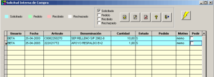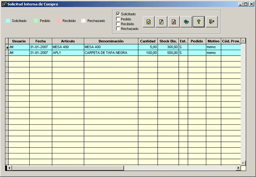 | S → Solicitado. Color Azul P → Pedido. Color Verde R → Recepcionado . Color Teja X → Rechazado. Color gris. |