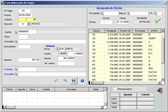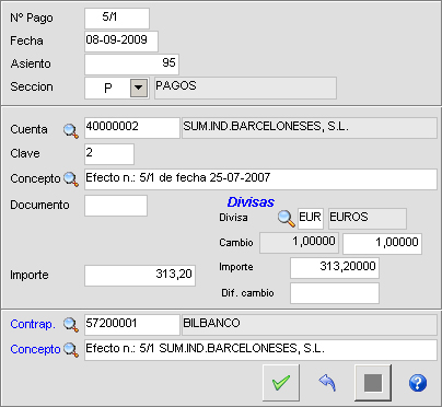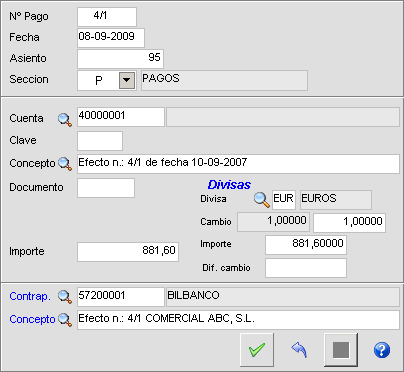 Una vez seleccionado el pago nos rellenará los campos de la pantalla, con los datos que tenemos definidos en la cartera de pagos. Para contabilizar el pago siempre cada asiento tendrá como partida o partidas: La Clave = 2, ya que la línea del proveedor es del Debe. La cuenta contable = el código del proveedor. El importe = el importe de vto. del efecto seleccionado. Si en el efecto estuviera definido el banco de negociación nos lo cogería directamente. |
